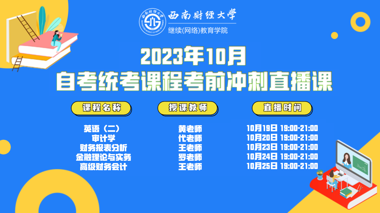 为进一步提高公司自考员工备考复习效率,加强统考课程复习引导,公司初步定于2023年10月19-20日、23-25日19:00-21:00开展《英语(二)》等5门自考统考课程的考前冲刺直播课。课程及时间安排如下(线上直播地址另行通知):