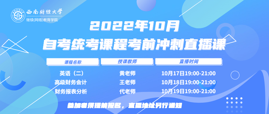 为进一步提高公司自考员工备考复习效率,加强统考课程复习引导,公司初步定于2022年10月17日至19日19:00-21:00开展《英语(二)》等3门自考统考课程的考前冲刺直播课。课程及时间安排如下(线上直播地址另行通知):