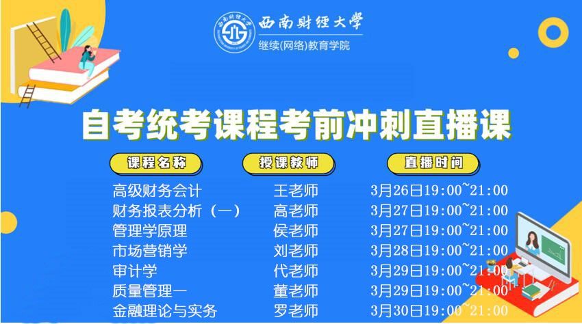 4月的自考统考进入倒计时,为了帮助大家高效备考,公司将于2024年3月26日起开展2024年4月自考统考课程考前冲刺直播课。课程及时间安排如下(线上直播地址另行通知):