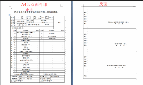 (二)完成网上信息申报后,学院将在2个工作日内进行初审,员工须及时关注,审核未通过的须按页面提示信息在申请时限内修改后再次提交,直至审核通过。审核通过的员工方可打印《基本信息登记表》和《四川省成人高等教育本科毕业生学士学位申请表》(后面简称学位申请表)。《学位申请表》为正反两面,须按打印设置要求使用A4纸双面打印如图: