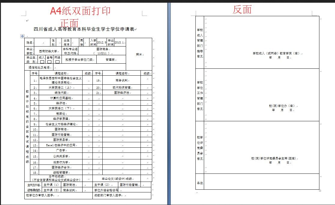 (二)完成网上信息申报后,公司将在2个工作日内进行初审,员工须及时关注,审核未通过的须按页面提示信息在申请时限内修改后再次提交,直至审核通过。审核通过的员工方可打印《基本信息登记表》和《四川省成人高等教育本科毕业生学士学位申请表》(后面简称学位申请表)。《学位申请表》为正反两面,须按打印设置要求使用A4纸双面打印如图: