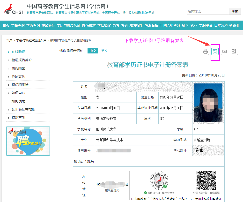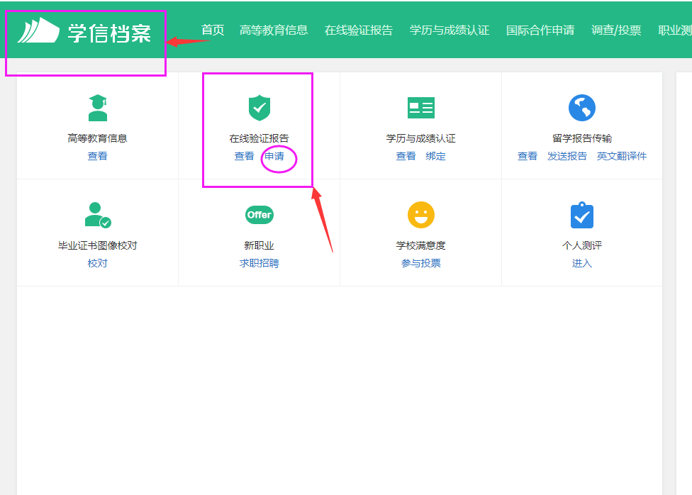 成功登录后,点击顶部菜单中的“在线验证报告”栏目,申请《教育部学历证书电子注册备案表》中文版。