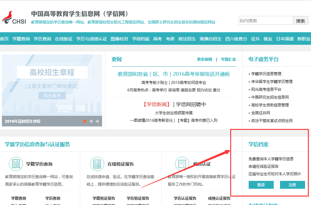 (1)员工登录“学信网”(http://www.chsi.com.cn/),进入“学信档案”注册实名账号,(注意:首次登录时需完成实名注册。每个手机号和身份证号只可注册一次,账号遗失的可通过学信网客服找回。)