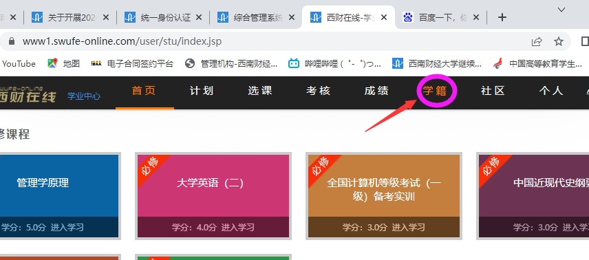 (一)登录“西财在线”员工平台,进入后“学籍”专栏(注意:因兼容性问题,请使用谷歌或火狐浏览器)。