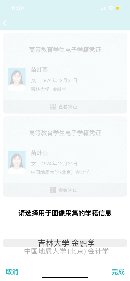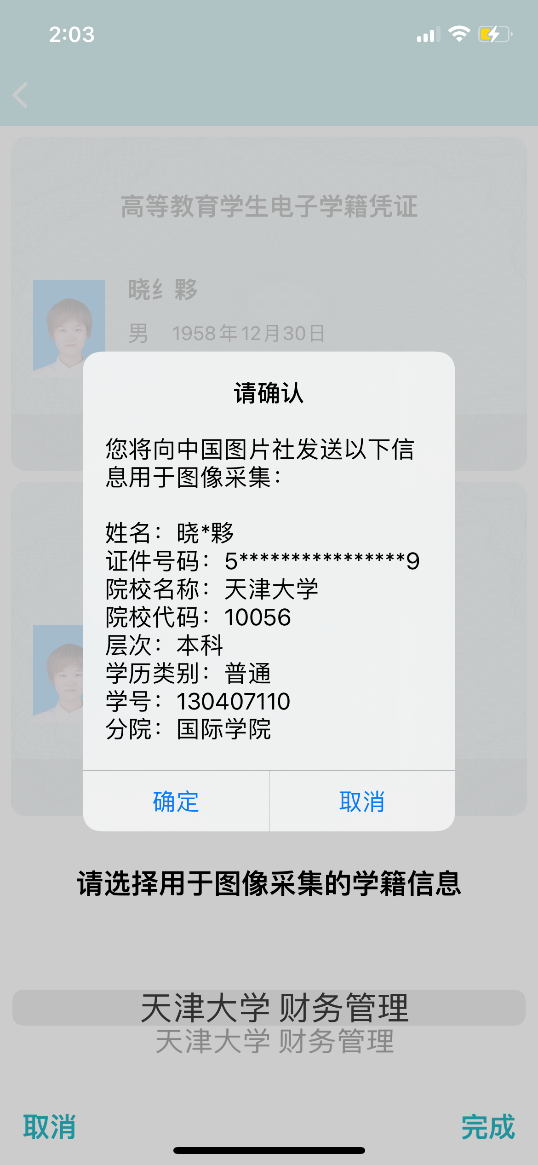 (七)、在学信网APP上选择需要进行图像采集的学籍信息,并确定发送;