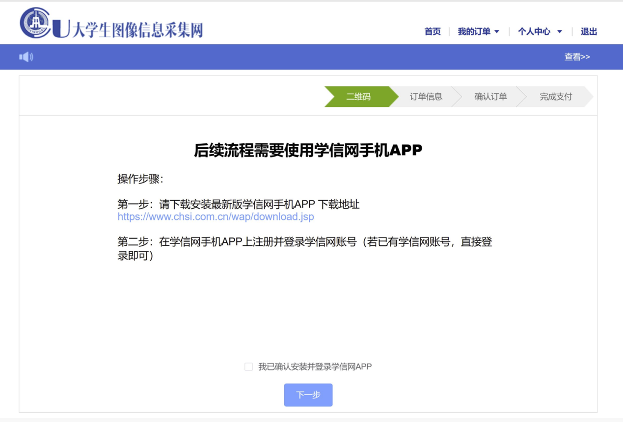 (四)、按照页面提示下载并注册、登录学信网APP,确认完成后,点击“下一步”;