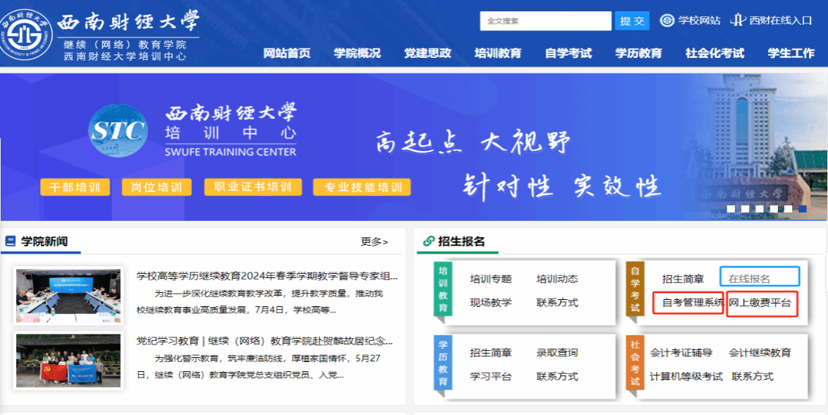 3. 自考管理平台、员工网上缴费平台 :7月16日9:00中断,7月16日12:00恢复访问,入口更换至官网首页右侧“自学考试”栏,见下图。
